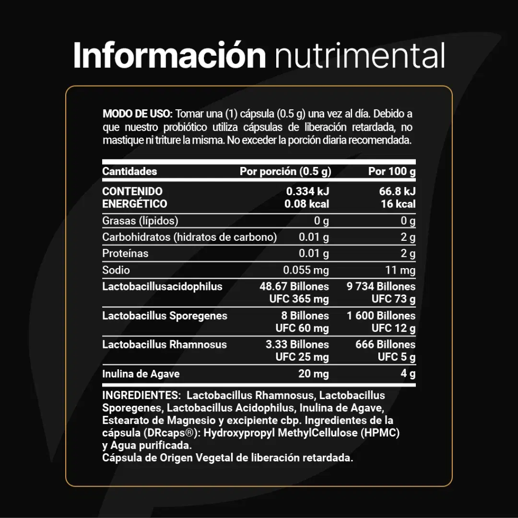 Mezcla de 3 cepas de probióticos combinadas con inulina de agave (prebiótico), en cápsulas de liberación retardada DRcaps, además de otros ingredientes conforme a la información oficial del envase.