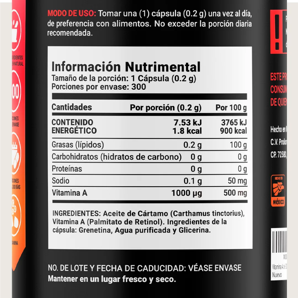 Aporte por cápsula Vitamina A 1000 mcg (con Aceite de Cártamo)