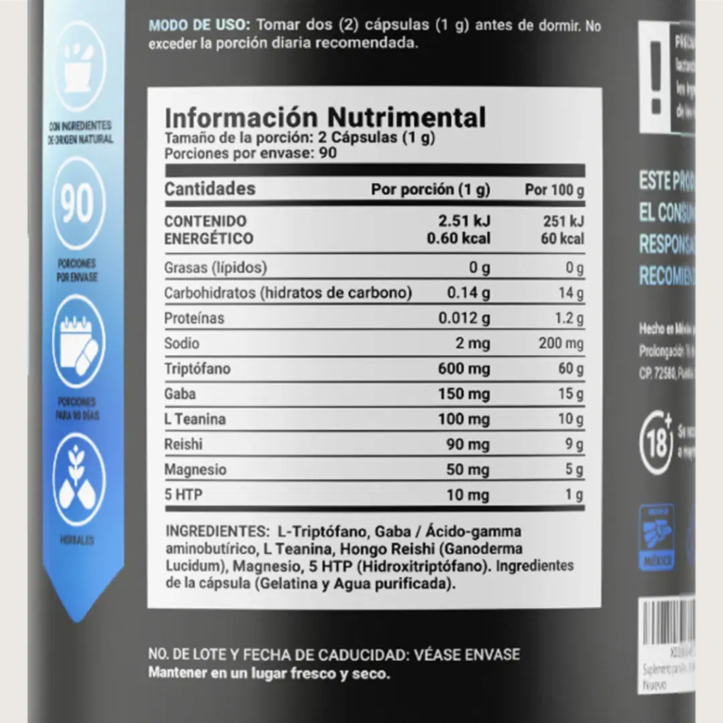 Ingredientes clave GABA, L-teanina, reishi, magnesio, 5 HTP